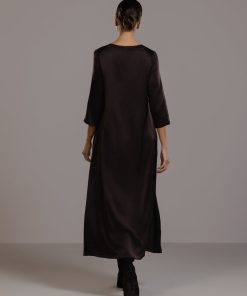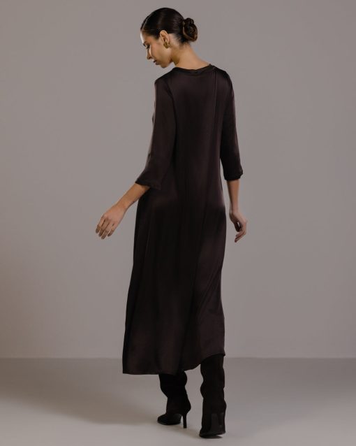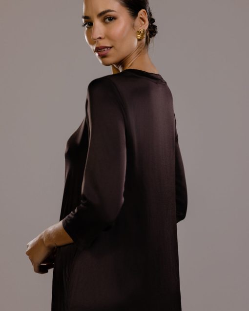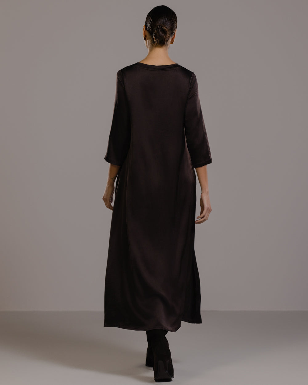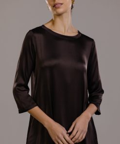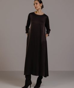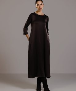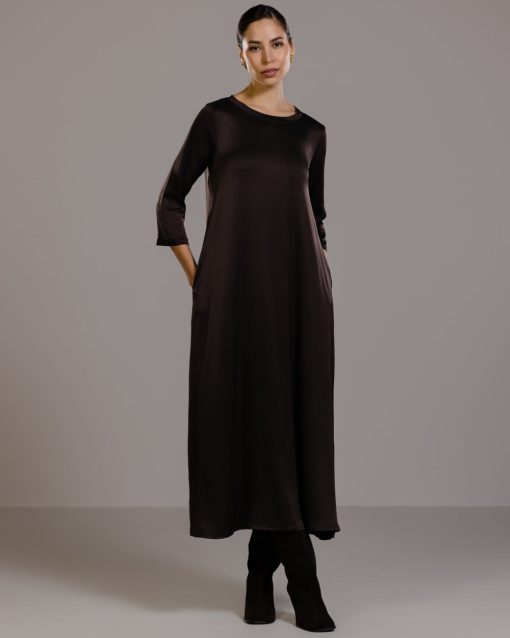 Slip in the smooth slinkiness of this sublime dress. Its luxurious satin fabric is enhanced with elastane offering a slight stretch for a flattering fit that moves with you. Meanwhile its full-length design and loose, relaxed silhouette drapes and flows gracefully. A round neckline and 3/4 length sleeves keep the look on the right smart side of casual. We recommend pairing this versatile satin dress with sleek heels for evening glamour or with casual flats for effortless daytime cool.Model is 5’7.