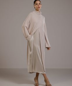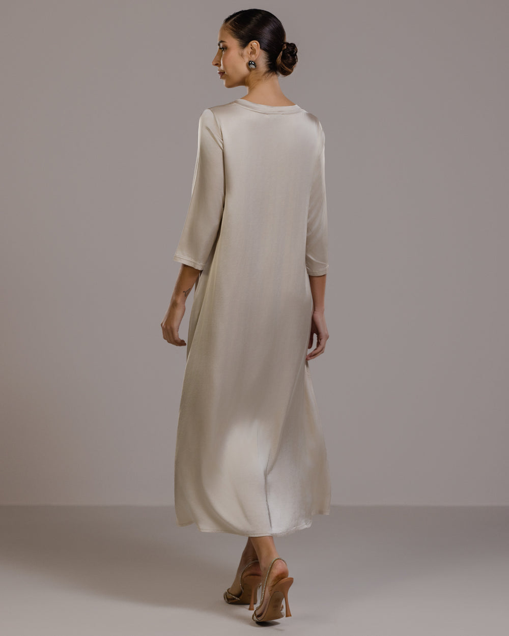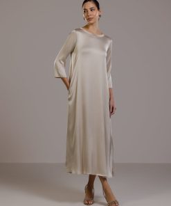 Slip in the smooth slinkiness of this sublime dress. Its luxurious satin fabric is enhanced with elastane offering a slight stretch for a flattering fit that moves with you. Meanwhile its full-length design and loose, relaxed silhouette drapes and flows gracefully. A round neckline and 3/4 length sleeves keep the look on the right smart side of casual. We recommend pairing this versatile satin dress with sleek heels for evening glamour or with casual flats for effortless daytime cool.Model is 5’9.